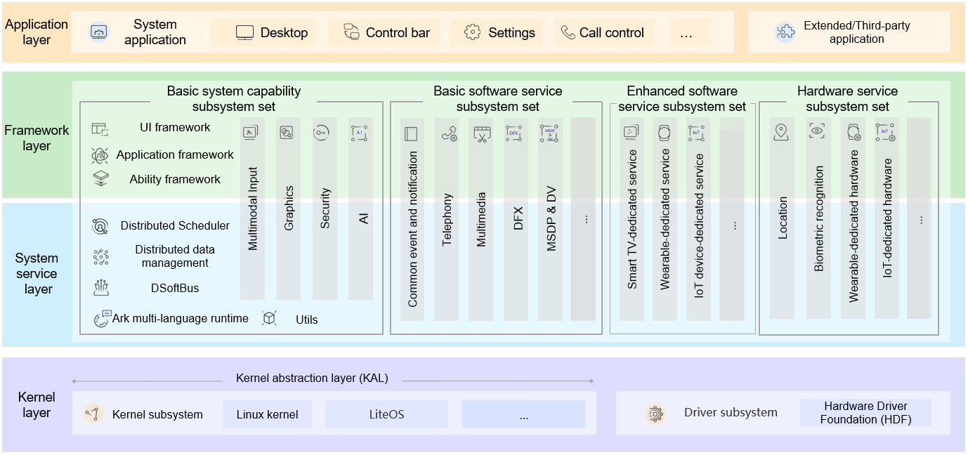 - Enhanced software service subsystem set: Provides HarmonyOS with differentiated and enhanced software services, including those dedicated to smart TVs, wearables, IoT devices, and more.