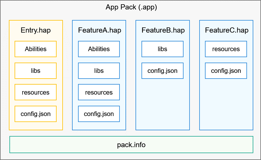 The user application package of HarmonyOS is released as an App Pack, suffixed with .app. It consists of one or more HarmonyOS Ability Package (HAP) files and the pack.info file that describes the attributes of each HAP file. The HAP files are used to deploy abilities, based on which you will code your HarmonyOS application.